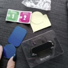 Each order comes with a rectangular- and circle-shaped adhesive magnet plate which you place onto the back of your phone. This magnet helps your phone stick to the magnetic holder strip.